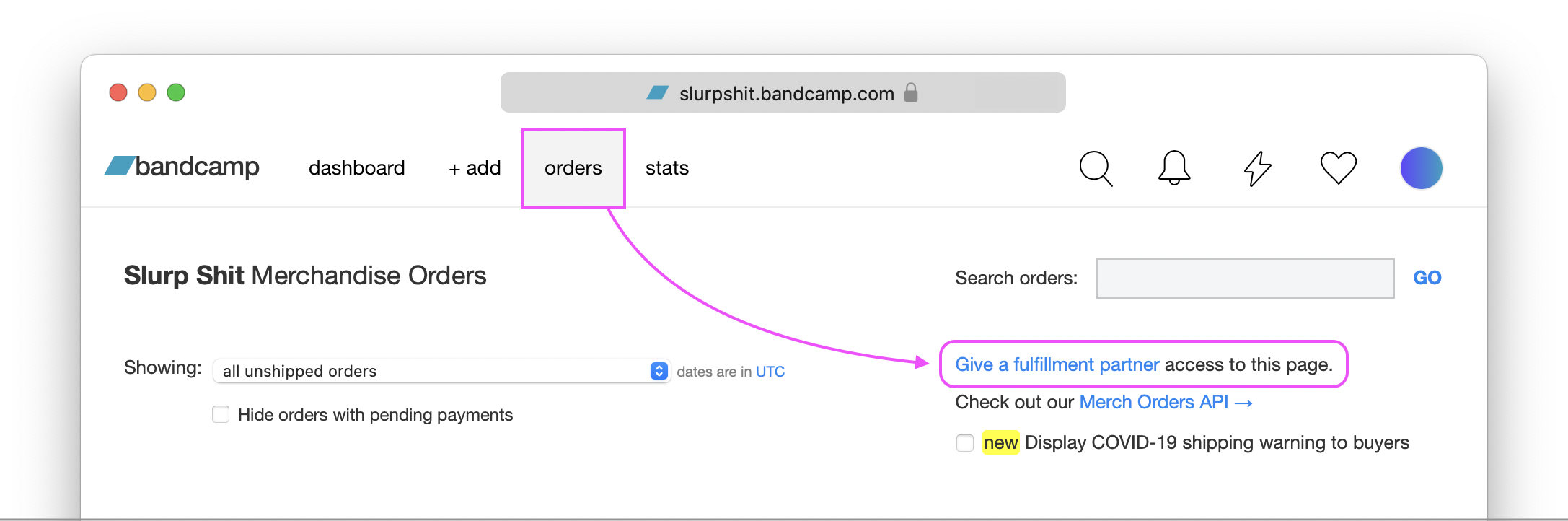 We have a fulfillment partner, could you please activate the SKU for our account: https://example.bandcamp.com